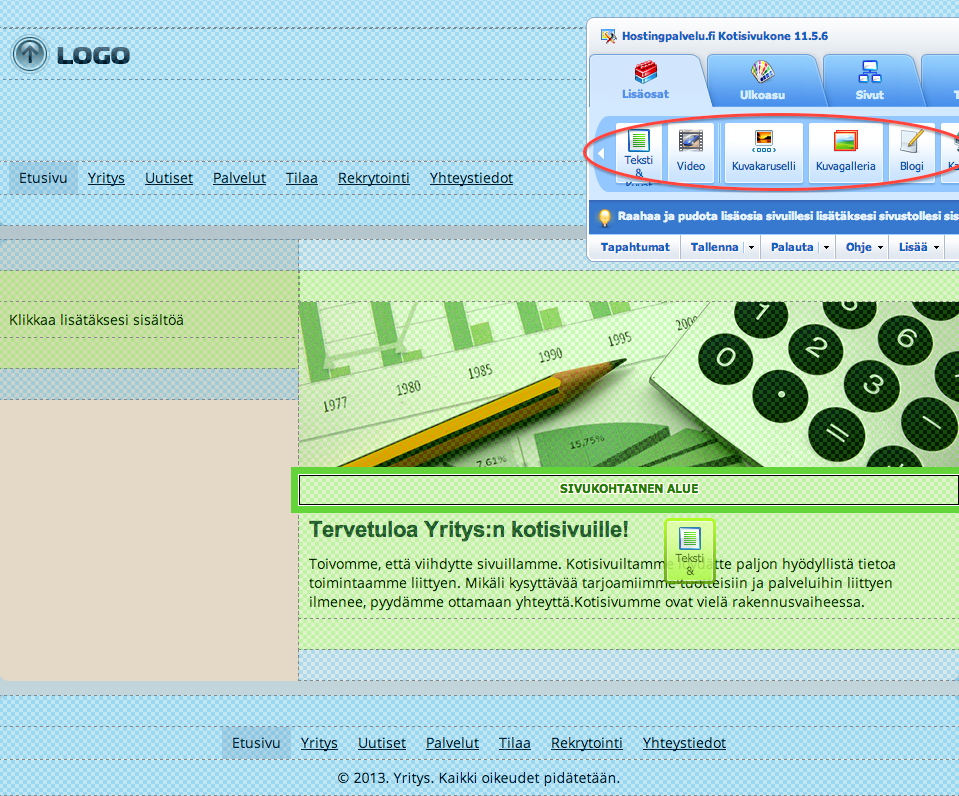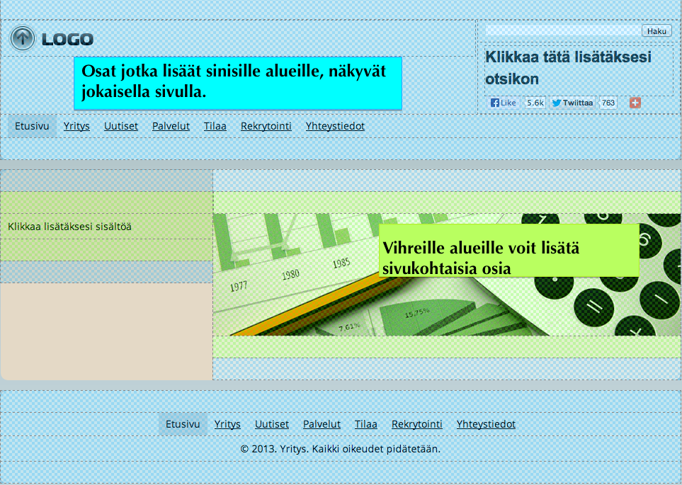 Sivut on jaettu osioihin. Vihreisiin osiin voi lisätä sivukohtaisia osia, kun taas sinisiin osiin voi lisätä osia, jotka näkyy jokaisella sivulla.