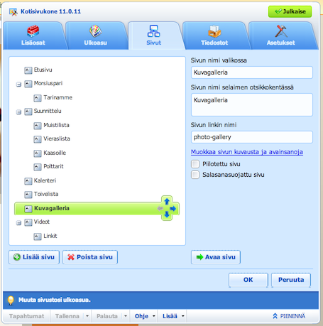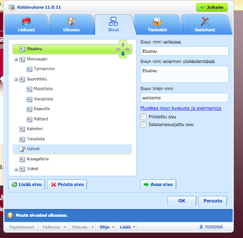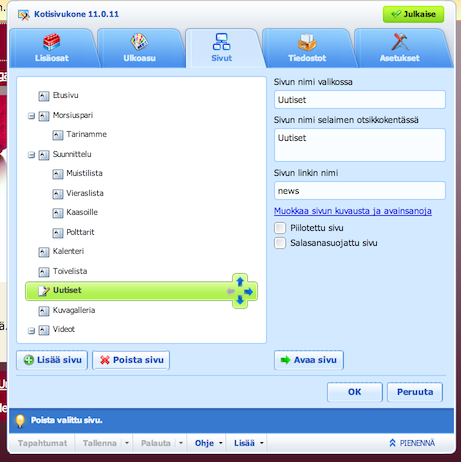 Kun sivu näkyy valittuna eli vihreänä voit muuttaa sen nimen, poistaa sen tai vaihtaa paikkaa suhteessa muihin sivuihin. Nyt haluamme poistaa sivun ’Uutiset’ ja klikkaamme siis ’Poista’.