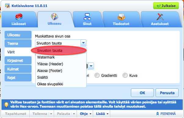 Valitse välilehdestä ulkoasu kohta värit. Valitse alasvetovalikosta ’Sivuston tausta’.